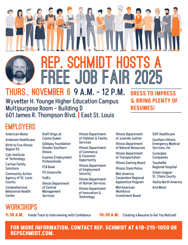 Join Rep. Schmidt for a free jobs fair on Thursday, November 6 from 9am-noon at the Wyvetter H. Younge Higher Education Campus Multipurpose Room, Building D, located at 601 James Thompson Blvd. in East St. Louis.