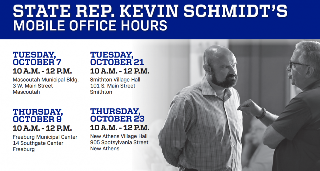 State Representative Kevin Schmidt will be hosting his Mobile Office Hours Events and he wants you to join! This is a great opportunity to discuss state legislature and what you would like to see from legislators in Illinois.