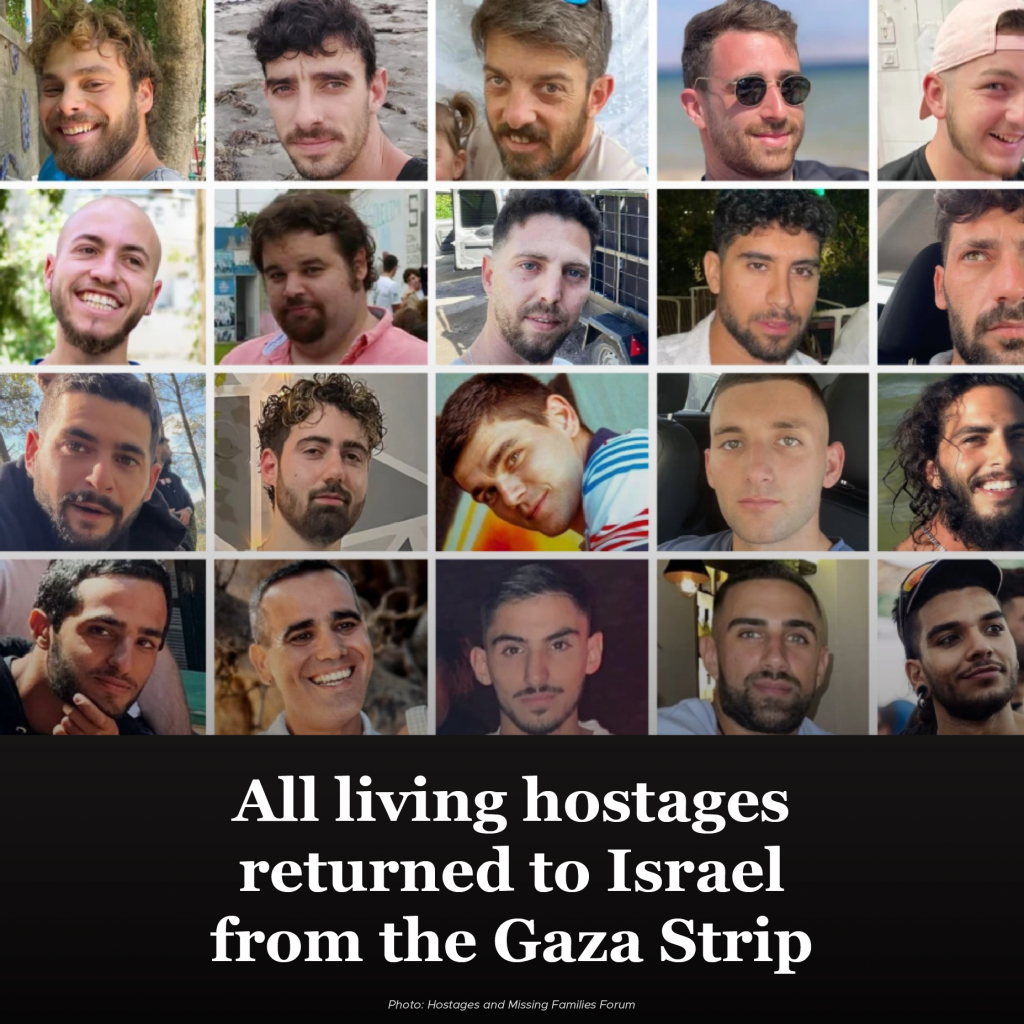 20 hostages were released to Israel in the first phase of the US-brokered peace deal. Thank you to President Trump for working diligently to bring them home!