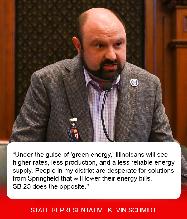 Springfield, IL…Gov. JB Pritzker signed a controversial energy bill into law yesterday. Critics say Senate Bill 25 will raise energy rates by $8 billion while leaving families and businesses with a less reliable energy supply. State Representative Kevin Schmidt said the legislation will create more burdens in his District which is why he voted no on SB25:
