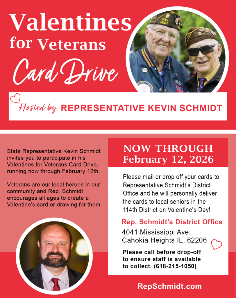 All ages are invited to create a Valentine’s card or drawing. Cards should be delivered to Rep. Schmidt’s office by mail or in person, located at 4041 Mississippi Avenue in Cahokia Heights no later than February 12, 2026. Please call before office drop-off to ensure staff is available to collect. The Valentine cards and drawings will be delivered to veterans residing in long-term care facilities located within the 114th District in time for Valentine’s Day.