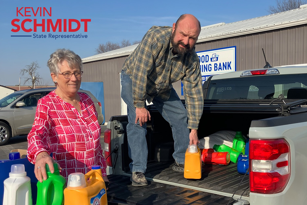 Freeburg, IL…State Representative Kevin Schmidt (R-Millstadt) has pledged to donate the legislative pay raise he voted against to different local organizations throughout his district to help families in need. This month he donated laundry detergent to the Freeburg Food and Clothing Bank.