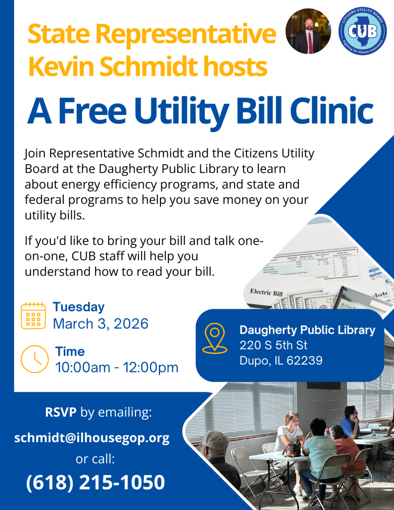 I have partnered with the Citizens Utility Board and will host a FREE Utility Bill Clinic on Tuesday, March 3rd, from 10:00am to 12:00pm at the Daugherty Public Library District , located at 220 S. Fifth St. Dupo, Illinois. The Utility Bill Clinic is a valuable opportunity for local residents to receive expert guidance on their utility bills.