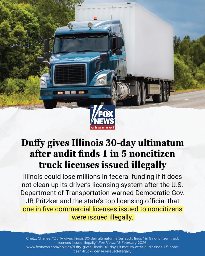 The more Governor Pritzker refuses to comply with federal requests, the more federal funding our state loses. This time, an audit has found that 1 in 5 noncitizen truck licenses were issued illegally in Illinois.