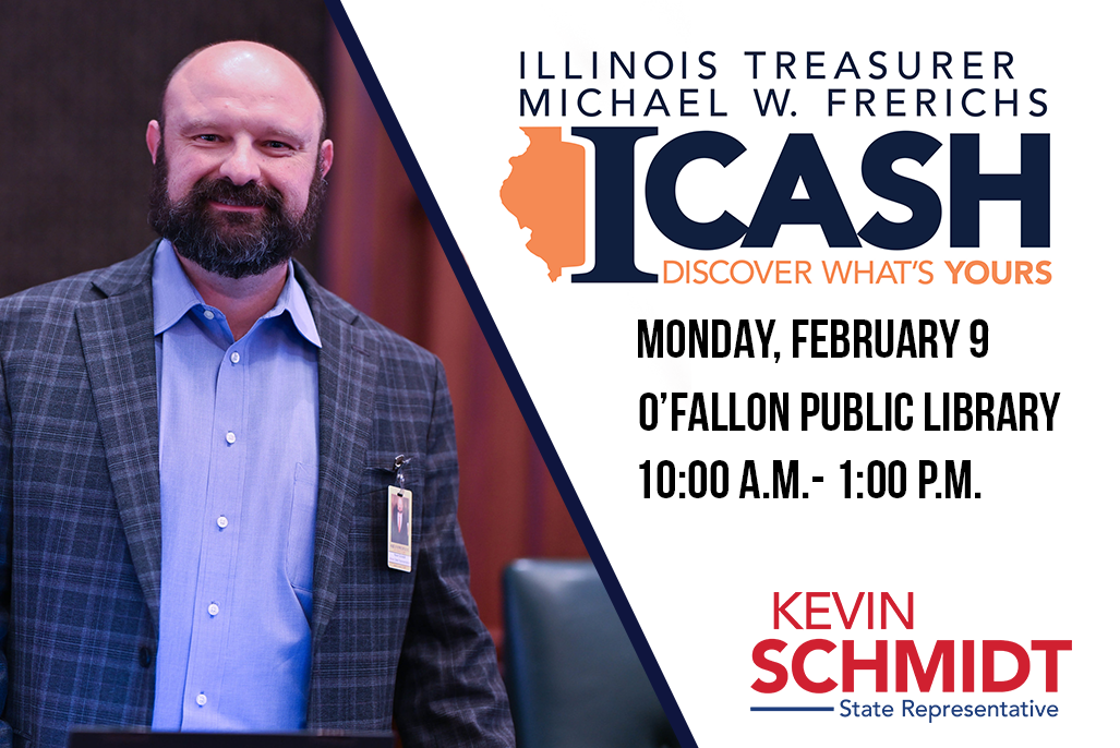 SAVE THE DATE State Representative Kevin Schmidt has teamed up with the Illinois State Treasurer’s Office to host an ICASH event Monday, February 9, 2026, at the O’Fallon Public Library….